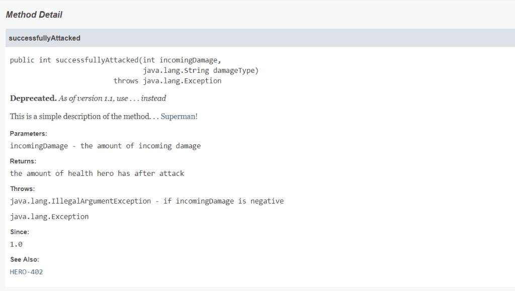 successfulAttacked 메서드에는 설명과 여러 개의 독립적인 블록 태그가 포함되어 있습니다.