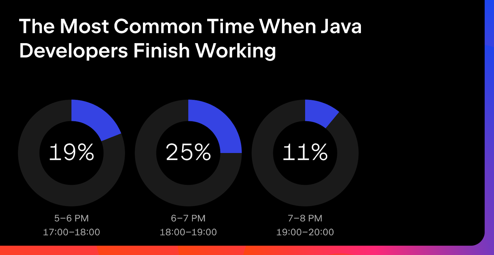 조사 결과에 따르면, 대부분의 개발자는 저녁 일찍 일을 마치지만, 무려 16%는 밤늦게까지(22:00 이후) 일하는데, 이는 건강한 일과 삶의 균형을 망칠 수 있습니다.
