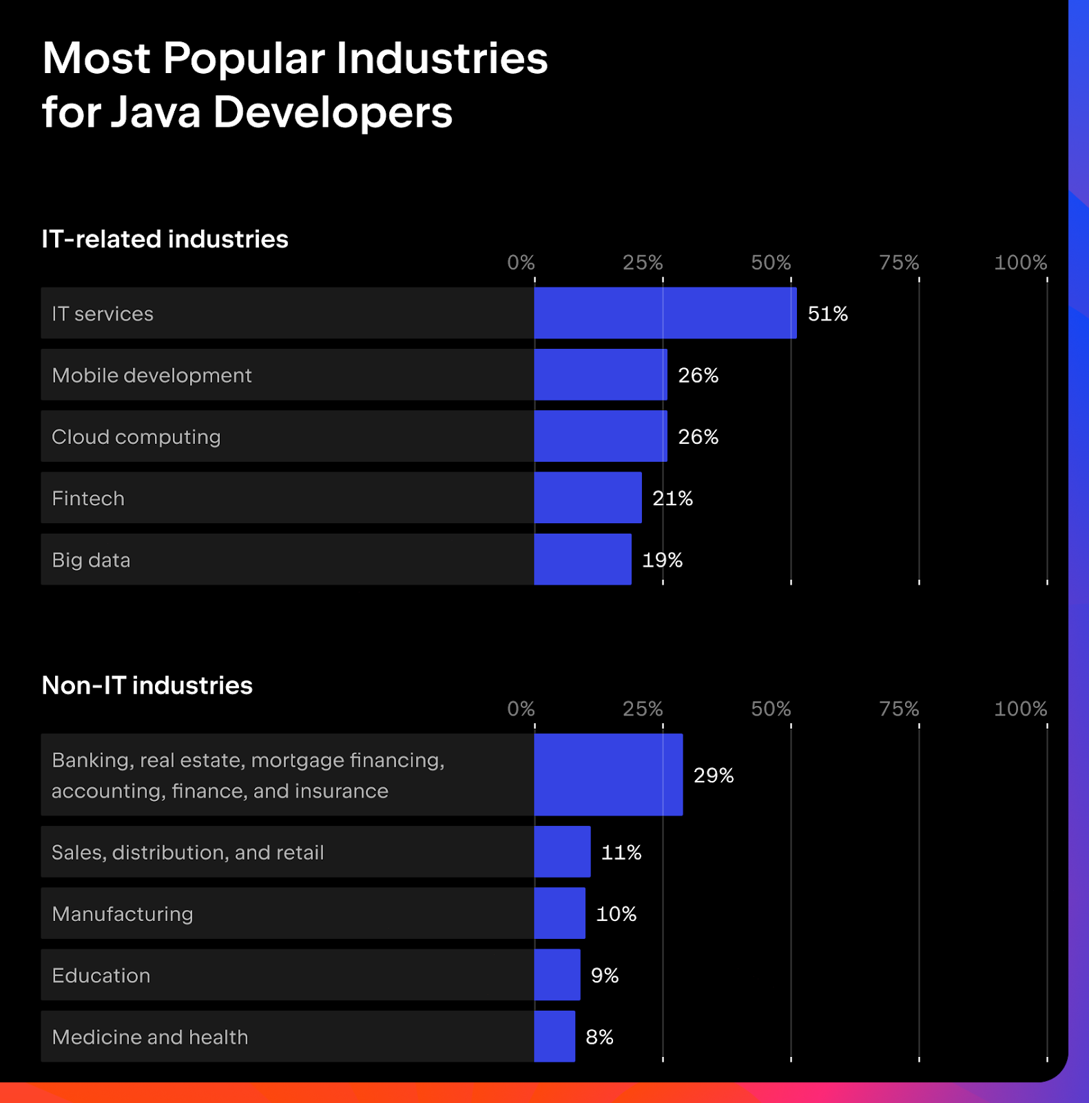 응답자의 73%가 IT가 회사의 핵심 사업이라고 답했습니다. IT 관련 산업 중에서 가장 인기 있는 산업은 IT 서비스, 모바일 개발, 클라우드 컴퓨팅, 핀테크, 빅데이터입니다. IT와 관련되지 않은 산업에서 일하는 개발자는 은행, 부동산, 모기지 금융, 회계, 금융, 보험에서 가장 자주 일합니다. 이 외에도 교육 및 제조, 의학 및 건강, 판매, 유통, 소매 등 다른 인기 있는 부문이 있습니다.