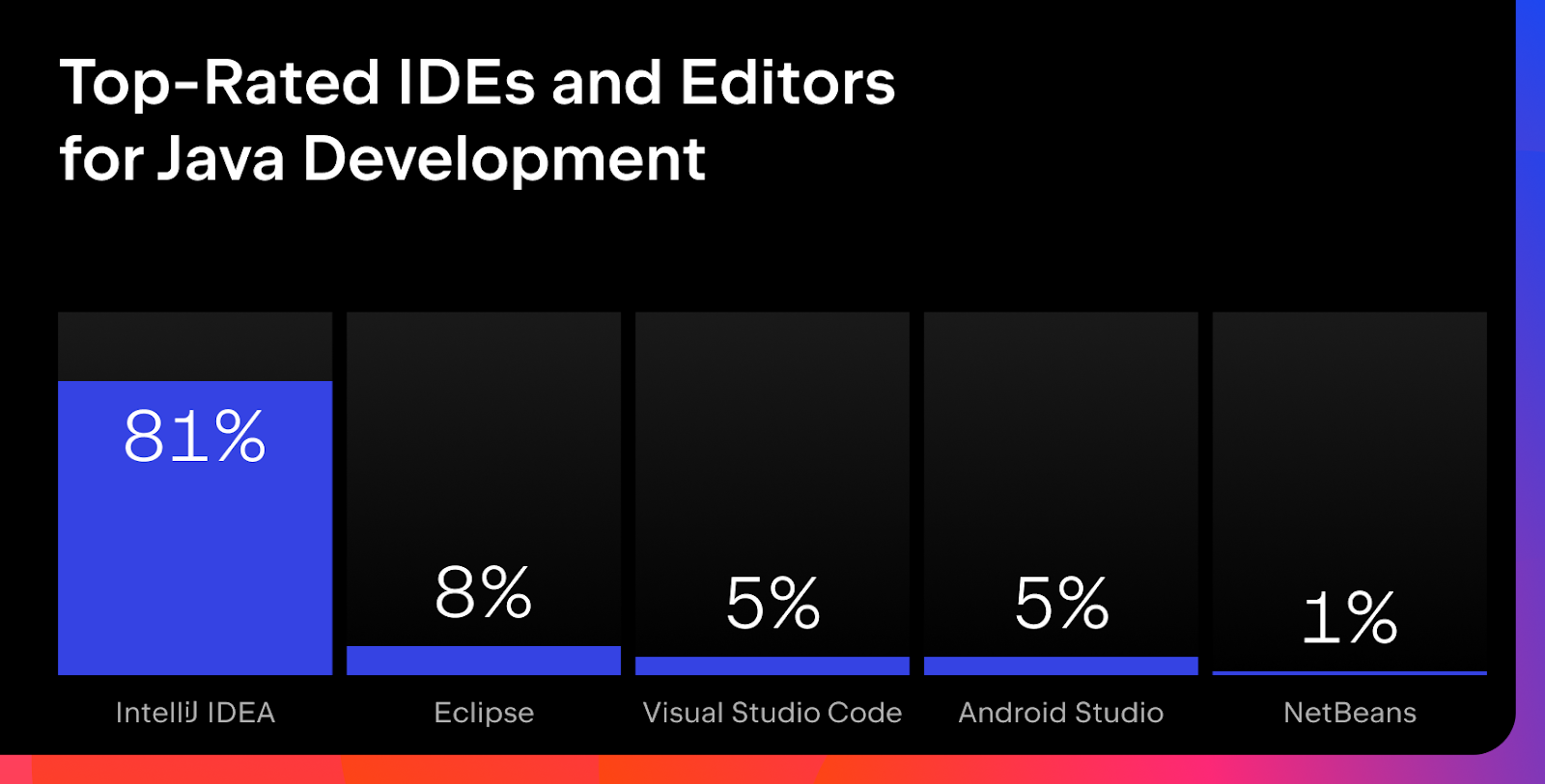 전문 Java 개발자는 IntelliJ IDEA를 IDE로 선호하는 경향이 강하며, 무려 81%가 JetBrains의 주력 제품을 선택합니다.