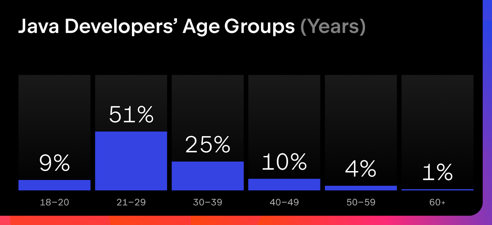Java 개발자의 연령 분포는 젊고 활기찬 커뮤니티임을 보여줍니다.