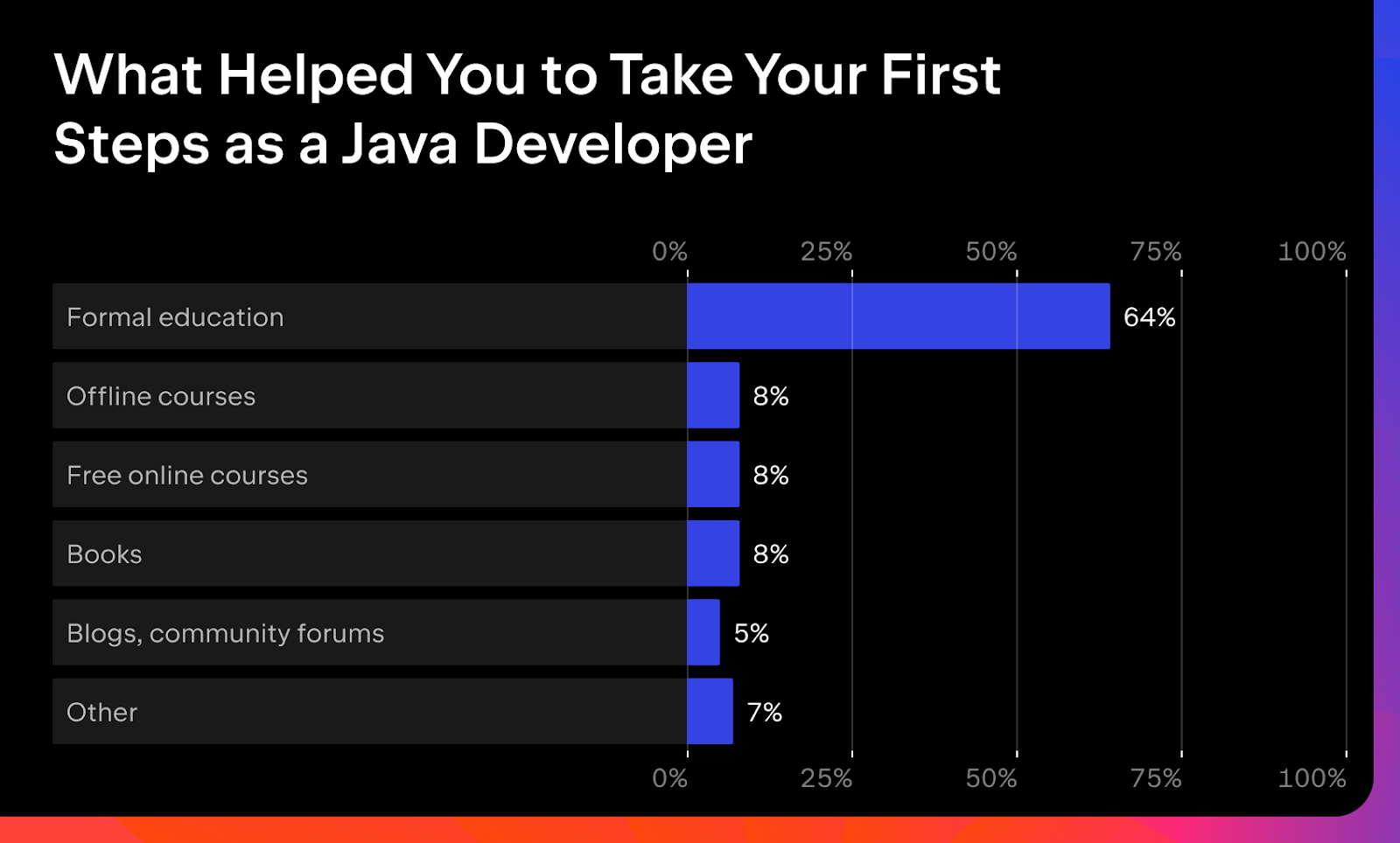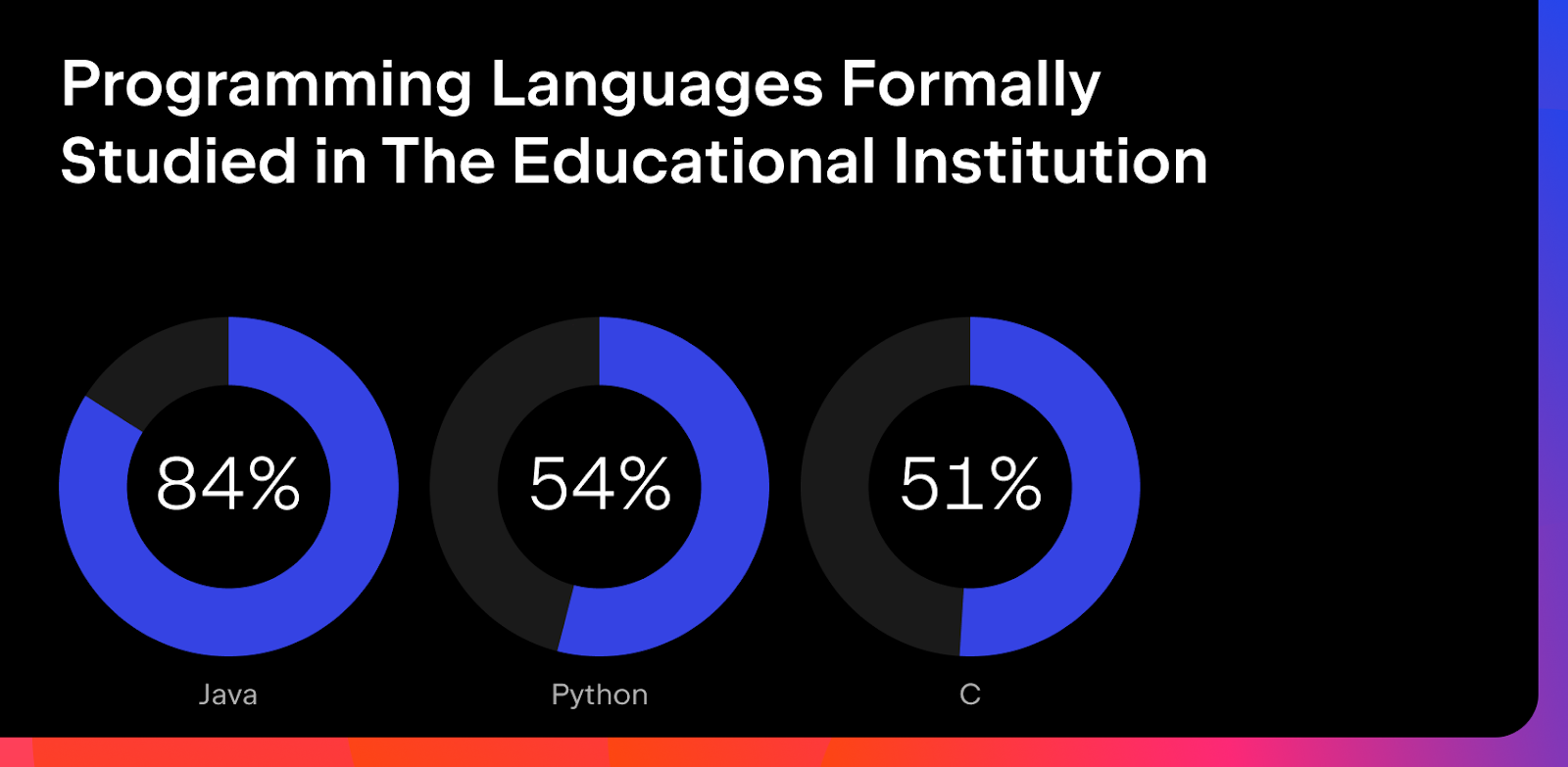 Java는 여전히 대학에서 가장 인기 있는 언어 중 하나입니다. 사실, 2023년 JetBrains Developer Ecosystem 설문 조사에 참여한 학생의 84%가 교육 기관에서 Java를 공부했다고 보고했고 , 64%는 정규 교육을 통해 개발자가 되기 위한 첫걸음을 내딛을 수 있었다고 언급했습니다.