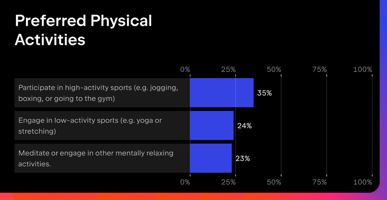 대부분의 개발자들이 비디오 게임을 즐기므로, 그들이 선호하는 장르에 대해 물어보았습니다. 선호하는 장르에는 액션 게임(48%), RPG(47%), 어드벤처 게임(45%), 전략 게임(42%)이 있습니다.