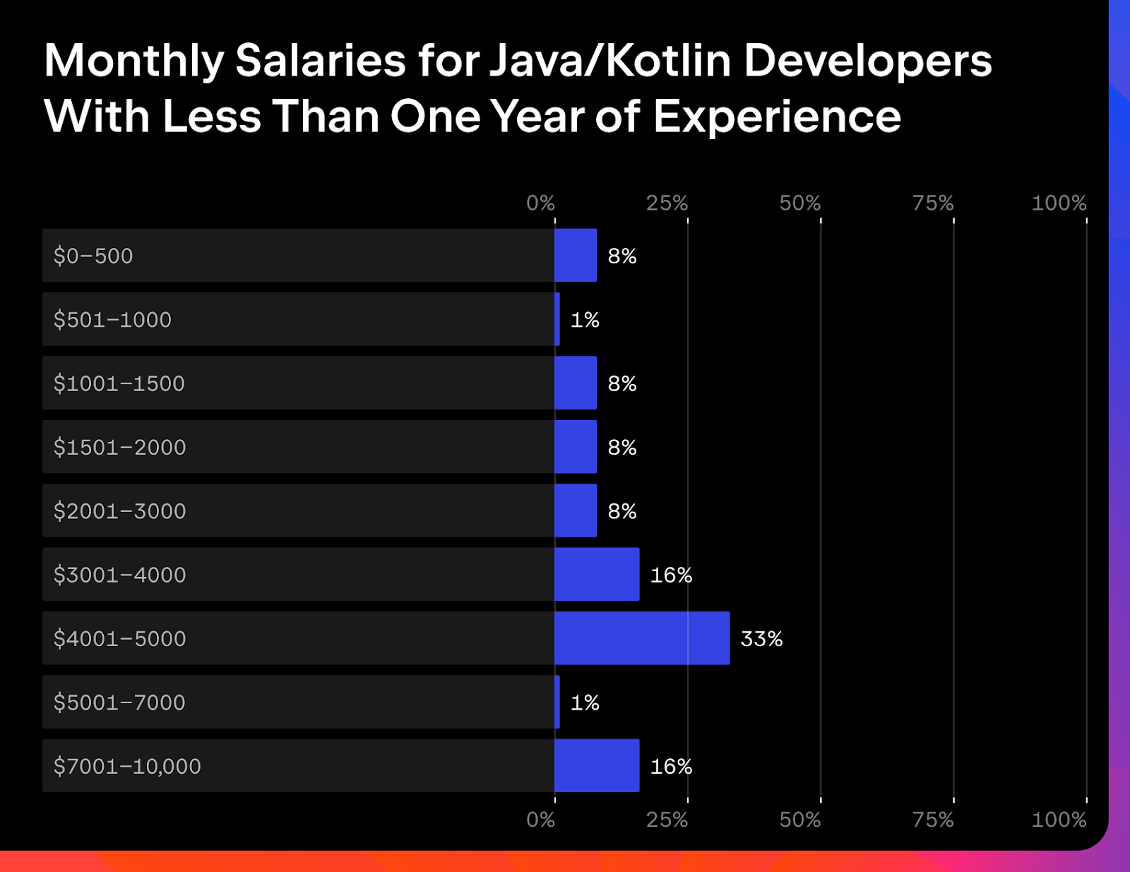 예를 들어, Developer Ecosystem: Data Playground 조사 에 따르면, 경력이 1년 미만인 신규 개발자의 33%는 미국에서 월 3,000달러에서 5,000달러 사이를 벌 것으로 예상할 수 있습니다. 이 수치는 보너스를 제외한 순 월급 분포를 나타냅니다.