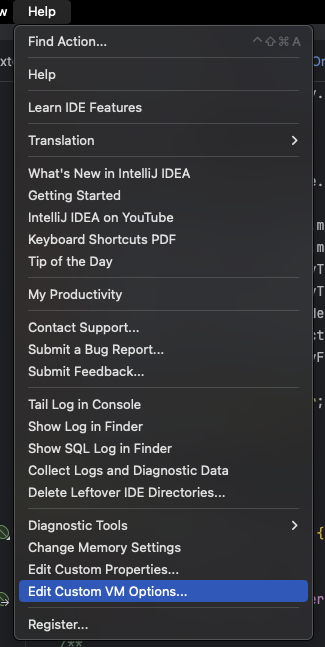 IntelliJ의 메뉴에서 "Help → Edit Custom VM Options..."를 클릭하여 VM Option창을 엽니다.